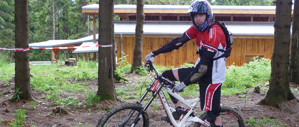 Ik ben Kevin Meiland, geboren in ‘92. Ik mountainbike al sinds mijn elfde en ben de club vier jaar later per toeval tegen gekomen in het bos. Sinds de zomer van 2014 geef ik training aan de jeugd. De kinderen kunnen mij herkennen aan een voorwiel dat op ooghoogte voorbij flitst… Ja ik ben een stuntman.
