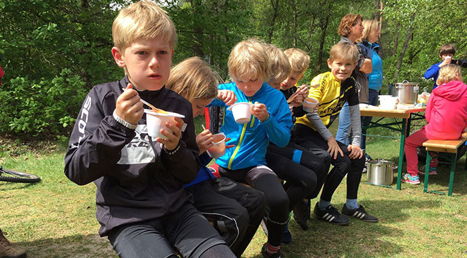 Dan de rode groep met Bea was een grote groep met enkele ouders want het niveau ligt voor sommige ouders al te hoog om mee te gaan. Eerst wat leuke singletracks voordat we de route van Zeist oppikten. Onderweg werd er nog wat “Trail” kunsten getraind en na 34 km kwamen zij ook weer terug op “De Bergjes”. Daar stond de “Koek en Soep” camper klaar voor de inwendige mens. Het was smikkelen van de tomatensoep en de ontbijtkoek, bananen etc. Iedereen genoot zowel de kinderen als de ouders en plezier staat voorop! Al met al een geslaagde jeugdactiviteit.